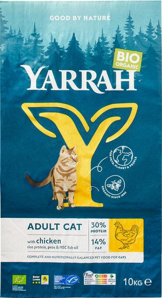 Ingredienten: Gedroogde kip* (20,5%), TARWE*, mais*, rijsteiwit*, SOJABONEN*, kippenvet*, gele erwten*, groene erwten*, zonnebloempitschilfers*, biergist, SOJASCHILFERS*, mineralen, MSC VISOLIE1. * = Biologisch. 1Uit een MSC gecertificeerde duurzame visserij.