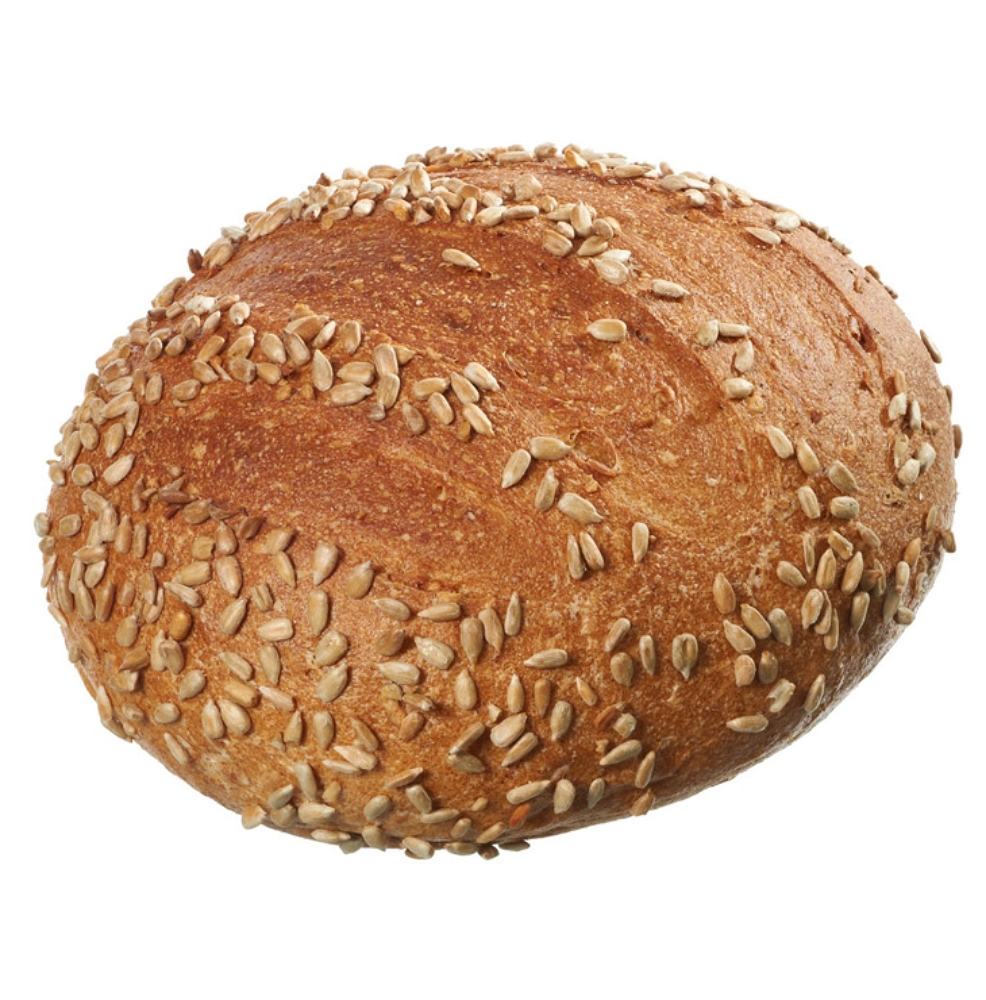 Een mooi luchtig biologisch desem vloerbrood van gebuild meel (Lemaire meel) rijk gedecoreerd met zonnebloempitten.
