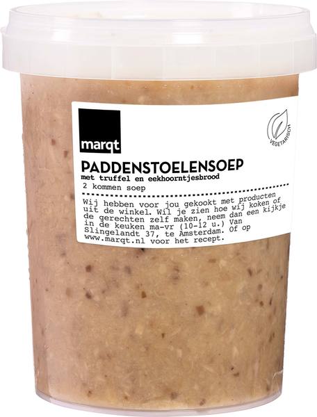 Groente bouillon* (water, KNOLSELDERIJ*, BLEEKSELDERIJ*, wortel*, ui*, knoflook*, laurier*, peper*, koriander*, jeneverbessen*), 26% paddenstoel*, ui*, Créme fraîche* (MELK), roomboter (MELK)*, zonnebloemolie*, witte wijnazijn*, 0,6% truffel, 0,6% gedroogd eekhoorntjesbrood, knoflook*, zeezout, peper* * = Biologisch