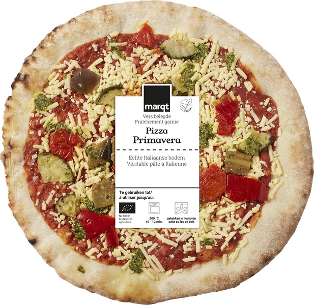 44,0% pizzabodem (TARWEbloem*, water, zonnebloemolie*, zout, gist), pizzasaus (17,1% tomatenpuree*, 1,1% tomatensap*, ui*, knoflook*, basilicum*, zwarte peper*), 9,6% cherrytomaat*, plantaardige rasp variatie met kokosmelk (kokosmelk*, aardappelzetmeel*, water, kokosolie*, erwteneiwit*, zout, natuurlijk aroma*, voedingszuur: melkzuur, kurkuma*), 4,0% courgette*, 4,0% aubergine*, 4,0% paprika*, 2,7% groene pesto (zonnebloemolie*, basilicumconcentraat, zout, pijnboompit*, knoflook*, wijnazijn*, voedingszuren: citroenzuur; melkzuur).* = Biologisch